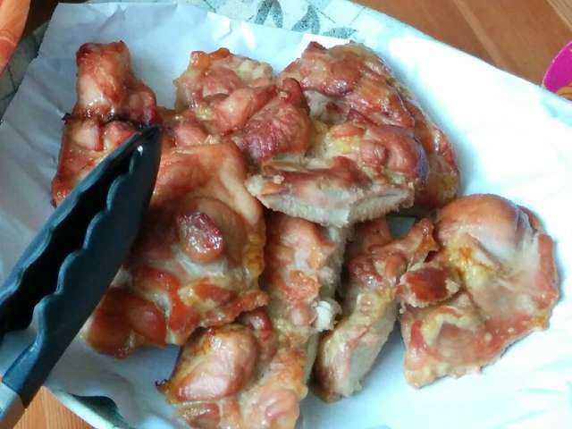 1 もも肉をaの調味液に30分以上漬け込む ホテルパンに乗せたアミに皮を上にして並べ コンビ 蒸気10 で220 7分 焼く.